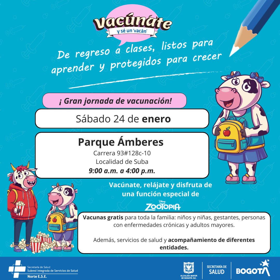 La salud y el regreso a clases van de la mano. Este sábado 24 de enero, la Localidad 11 de Suba vivirá una Gran Jornada de Vacunación en el Parque Ámberes, un espacio pensado para que niñas, niños y familias se protejan, aprendan y disfruten.
