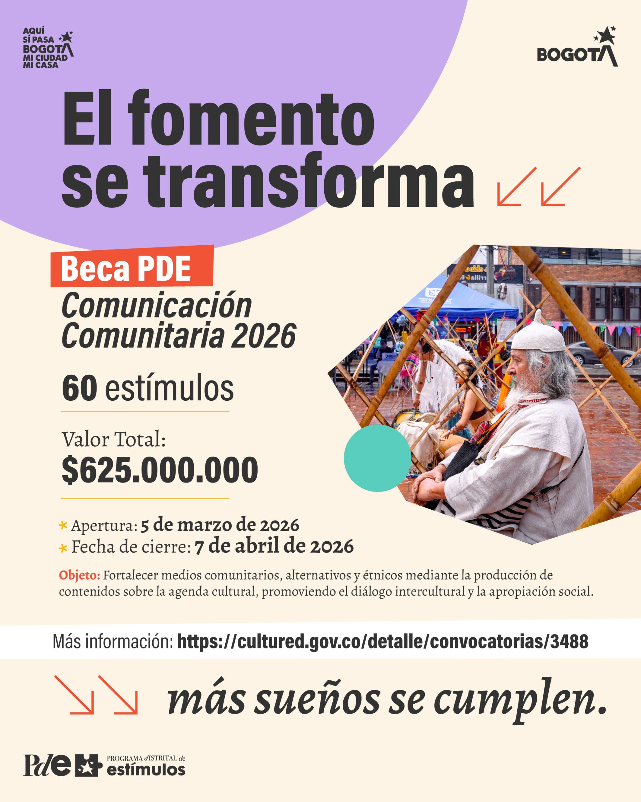 ! El Instituto Distrital de la Participación y Acción Comunal (IDPAC) extiende la invitación de la Secretaría de Cultura, Recreación y Deporte, en el marco de la Política Pública Distrital de Comunicación Comunitaria y Alternativa 2023–2034, para participar en la convocatoria Beca Comunicación Comunitaria 2026, que hace parte del Programa Distrital de Estímulos (PDE).